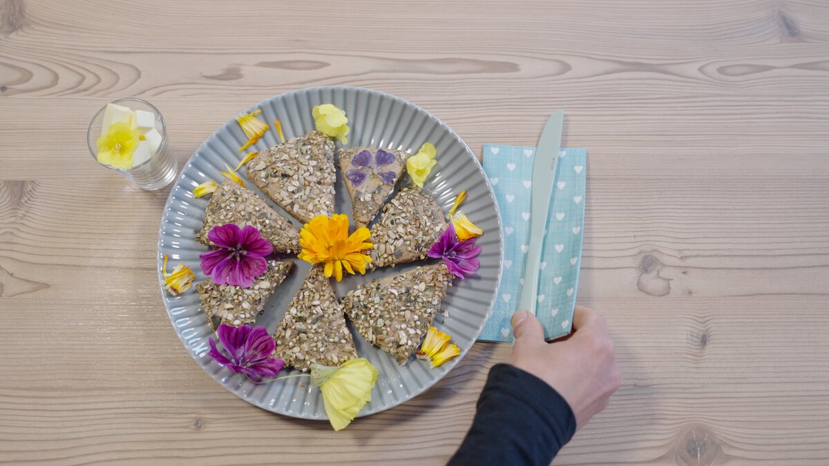 Dem Teig können noch frische essbare Blüten (fein geschnitten) oder auch getrocknete Blüten hinzugefügt werden.