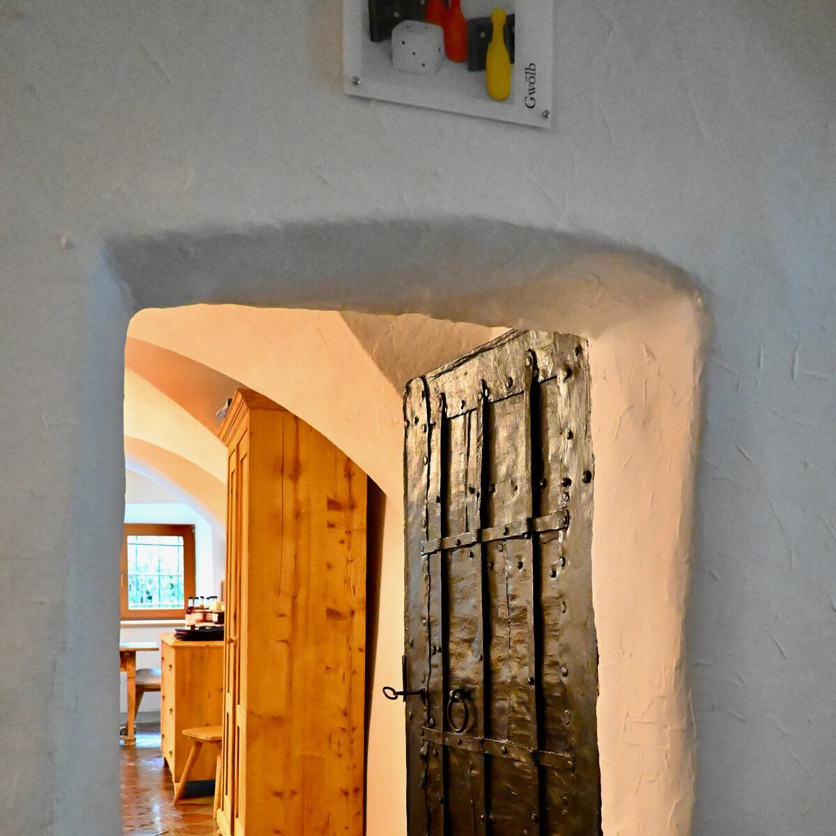 Das historische Gebäude selbst ist nahezu original erhalten – besonders das Parterre mit seinem charakteristischen Gewölbe zeugt von jahrhundertealter Handwerkskunst. Im Spielezimmer wurden antike Bauernmöbel aus dem Haus zusammengetragen und neu arrangiert. Ein besonderes Highlight ist der 500 Jahre alte Hackstock aus Lärchenholz, der als Tisch dient – ein Stück lebendige Geschichte, das einst 200 Jahre im Wald wuchs und seit 300 Jahren im Haus in Gebrauch ist. Die Bilder an den Wänden im „G’wölb“ sind bis zu 300 Jahre alt und erzählen ihre eigene Geschichte.